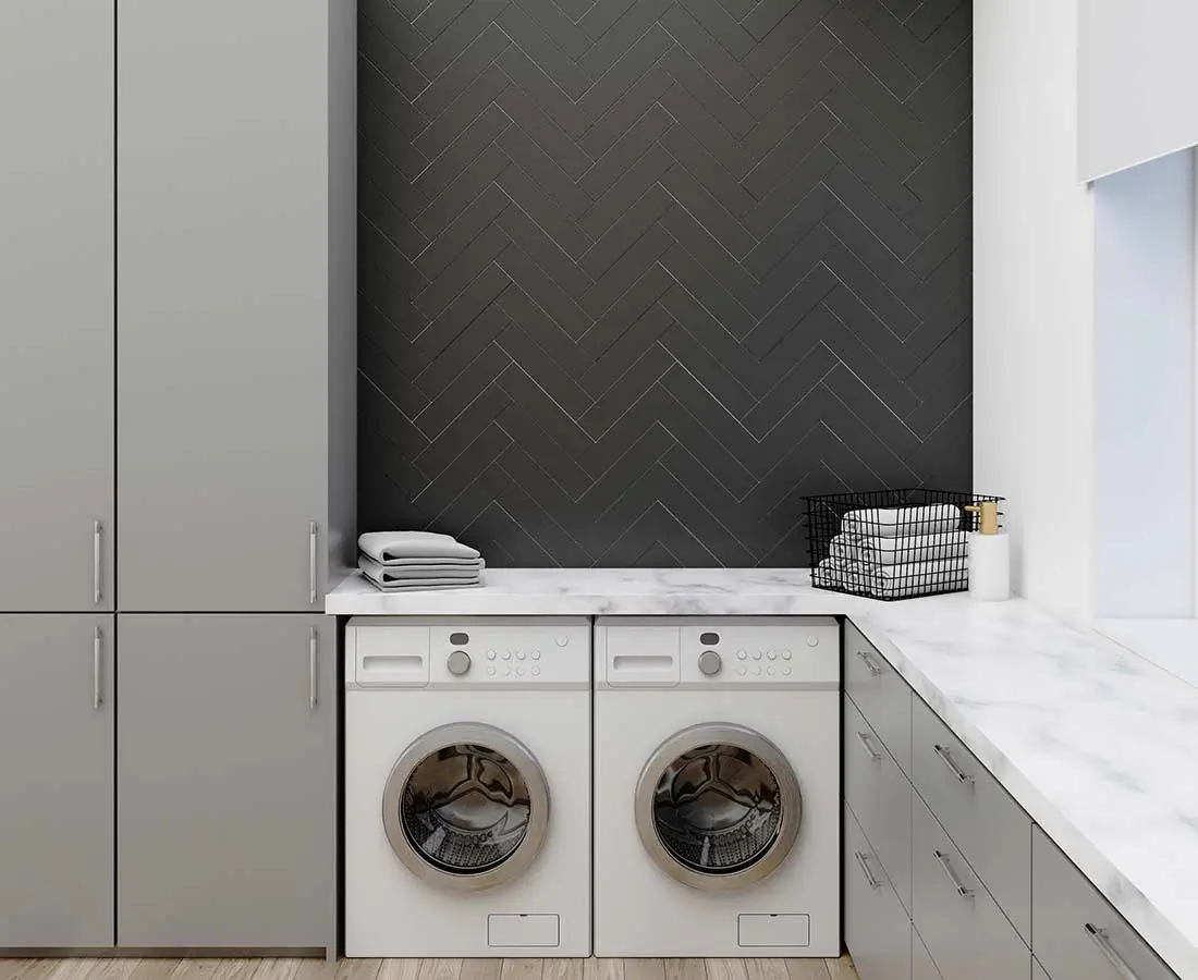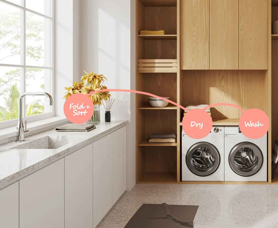 Coordinate your laundry cabinetry with your kitchen or bathroom to create a cohesive look. Decide between modern flat panel doors or shaker-style doors based on your home’s aesthetic. Add characters with splashback tiles that bring colour or texture to the space. Match your hardware and tapware finishes to complement your overall design.