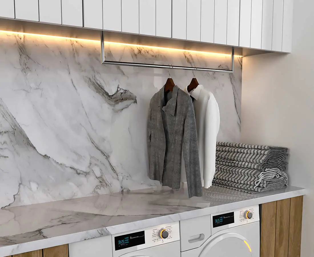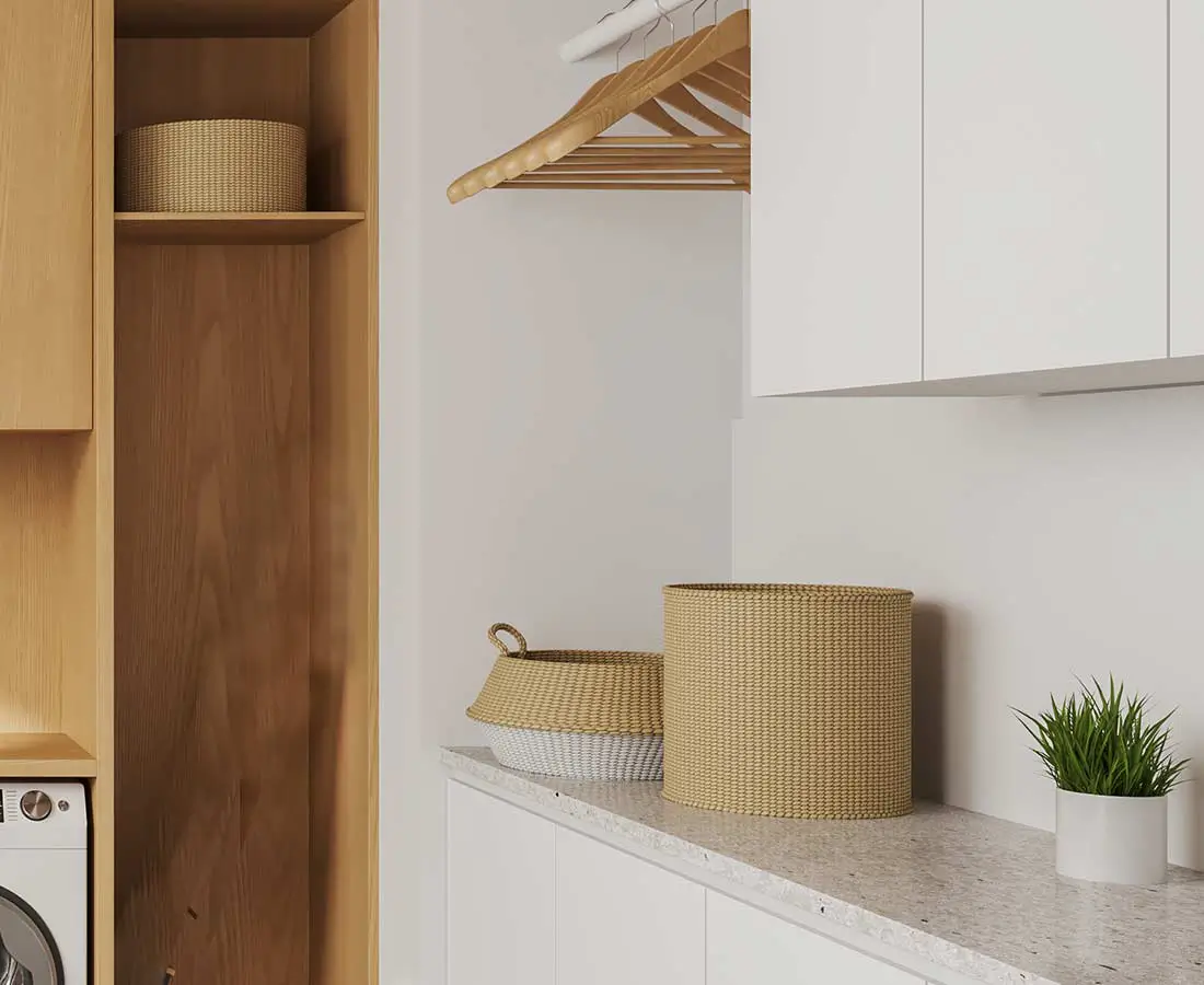 Moisture-resistant cabinetry is essential for Sydney laundries to prevent damage from dampness and humidity. Durable stone or laminate benchtops provide easy-to-clean surfaces that withstand daily wear and tear. Choose flooring that is simple to mop and maintain, ideal for wet areas. Soft-close hinges and drawers add durability and a touch of quality that lasts.